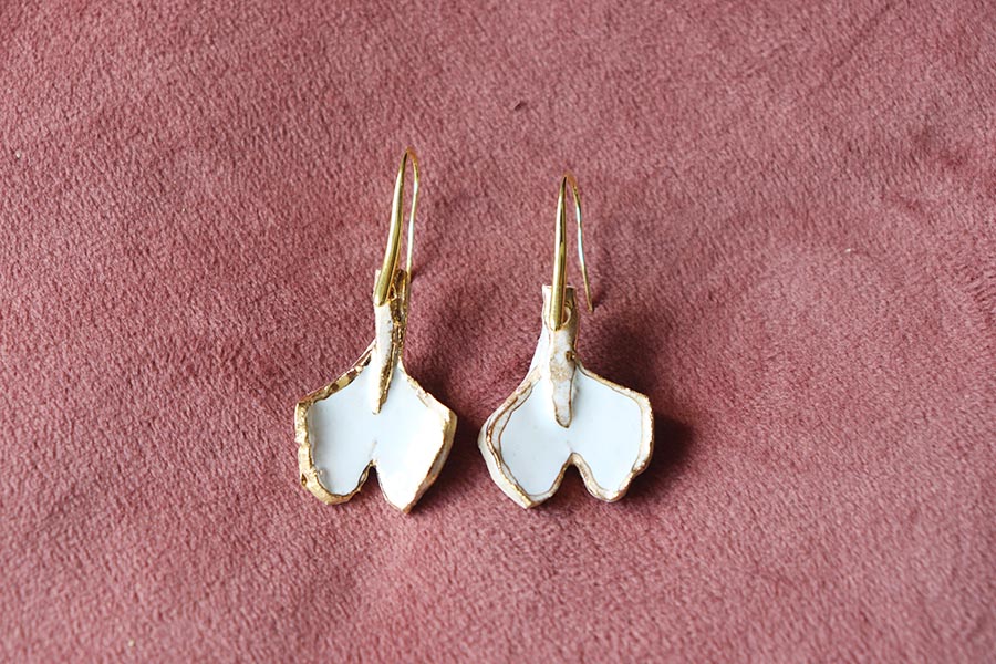 Białe kolczyki z akcentem złota w kształcie liści miłorzębu