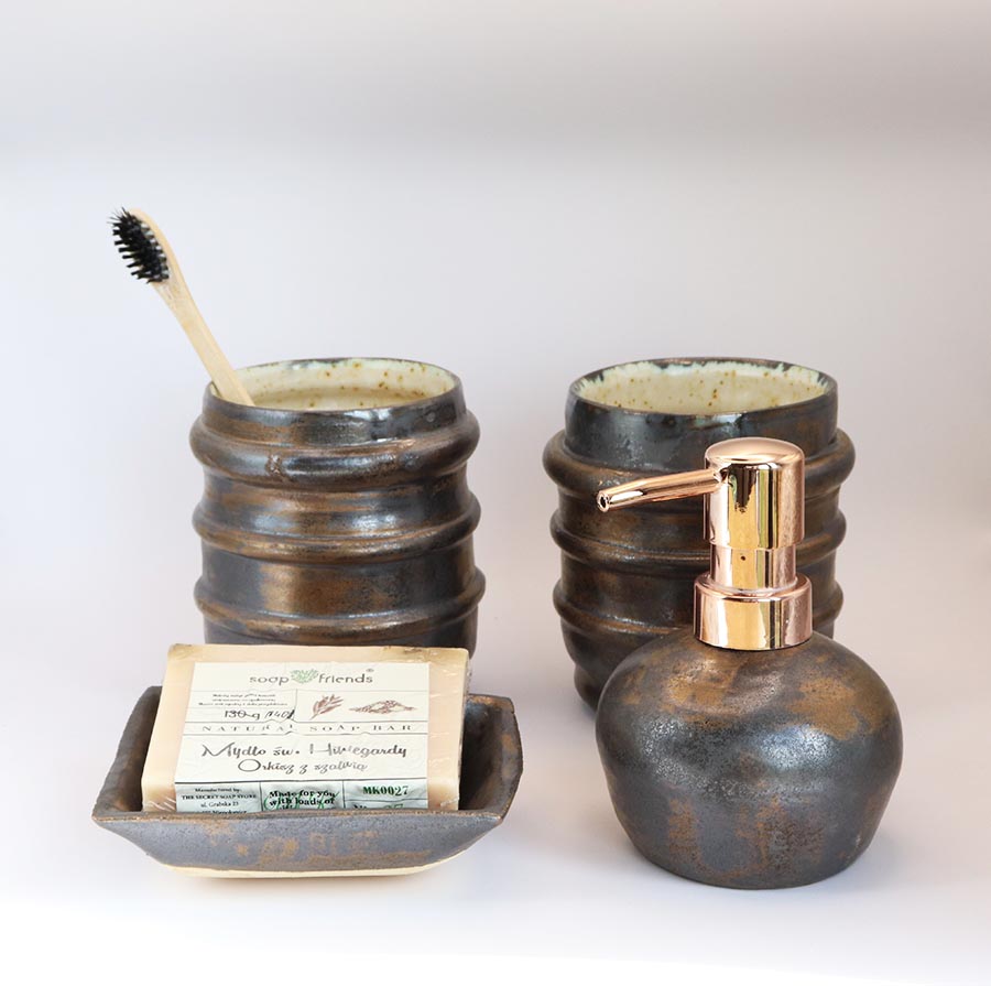 Dodaj wyjątkowego charakteru swojej łazience dzięki unikatowemu zestawowi ceramicznemu w stylu loftowym. Każdy element został wykonany ręcznie z wysokiej jakości gliny i szkliwiony w odcieniach matowej czerni i rdzawej miedzi. Połączenie surowej estetyki z elegancją daje nowoczesny i ponadczasowy efekt.