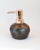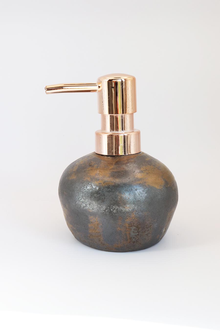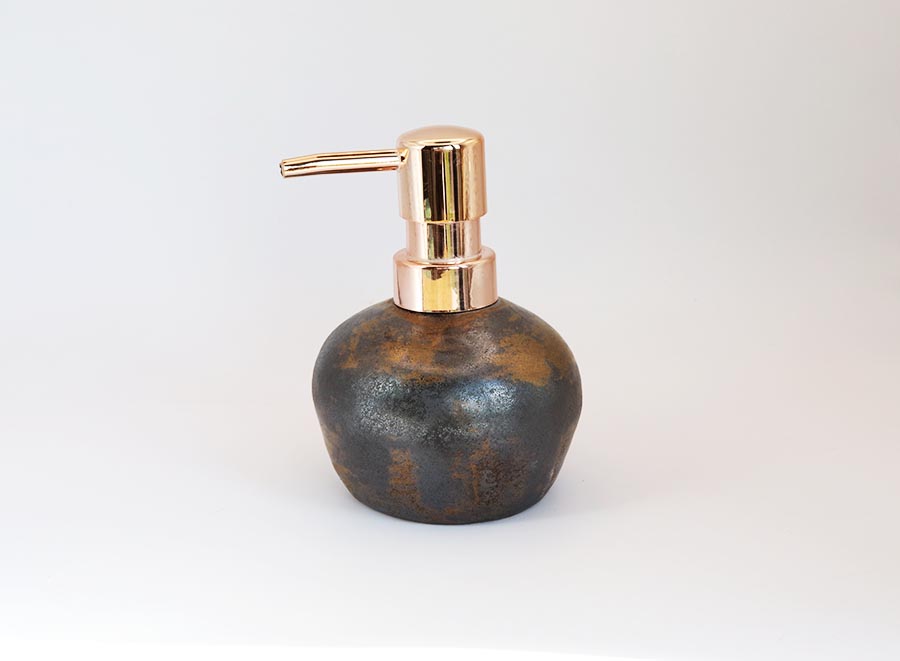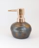 • dozownik na mydło w płynie z metalową pompką w kolorze różowego złota (miedź),