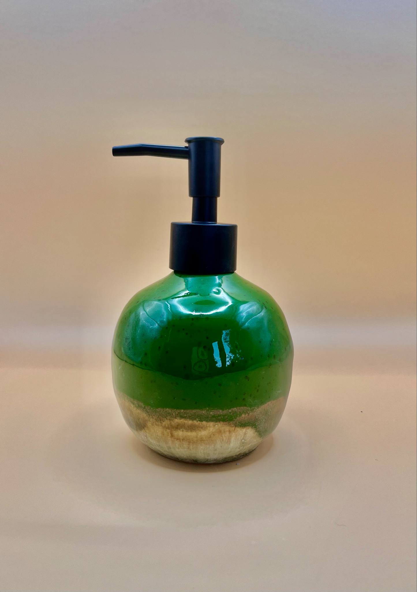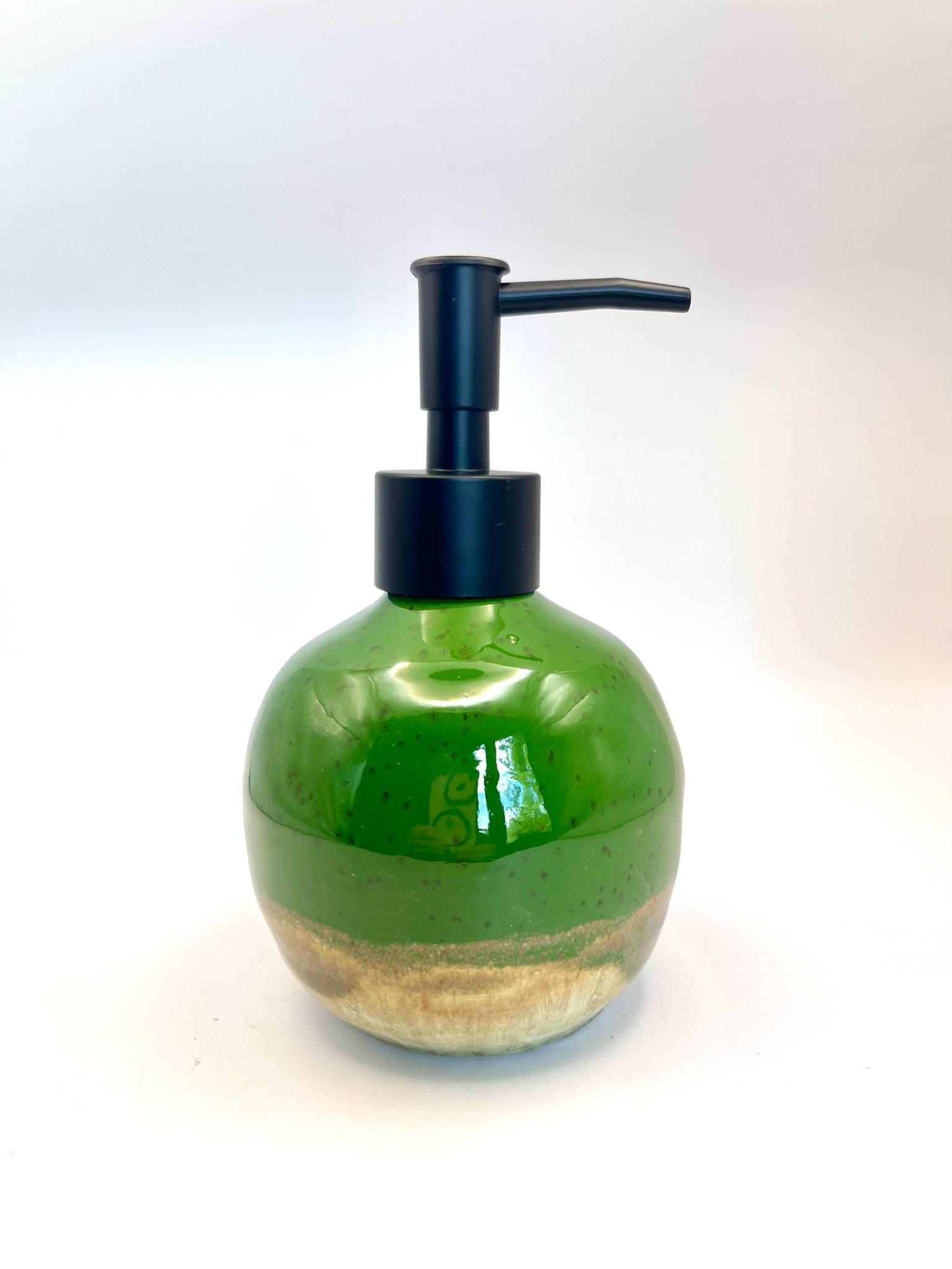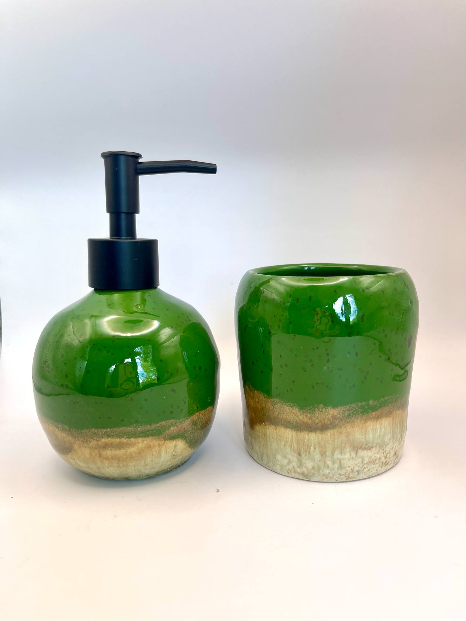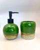 Zestaw pokryty jest szkliwem w pięknym, głębokim odcieniu zieleni z subtelnymi przejściami kolorystycznymi, które nadają mu naturalny, organiczny charakter. Dzięki temu każdy egzemplarz jest jedyny w swoim rodzaju. Dozownik wyposażony jest w elegancką pompkę – do wyboru: złota, srebrna, czarna lub miedziana, co pozwala dopasować zestaw do stylu Twojej łazienki.