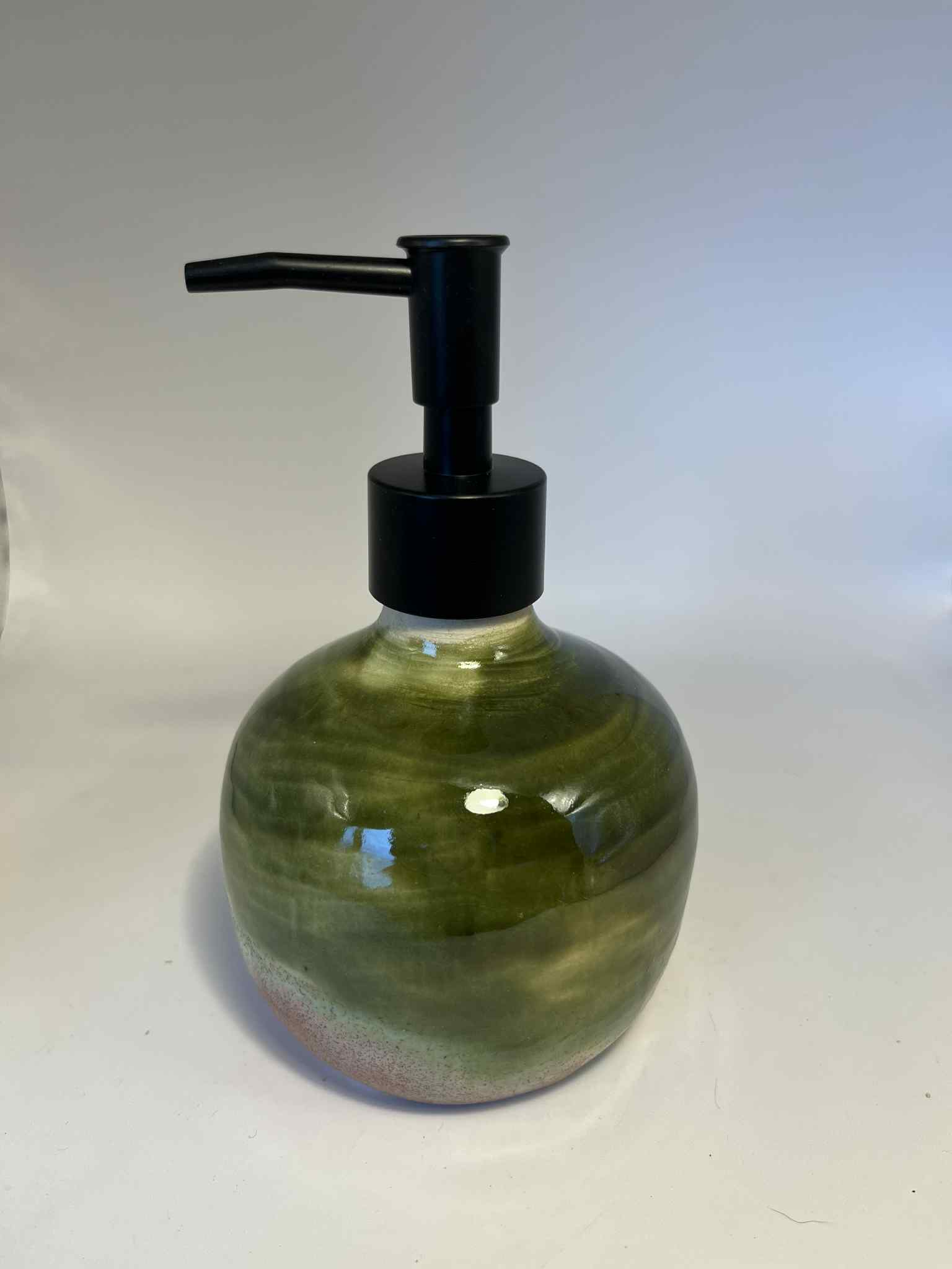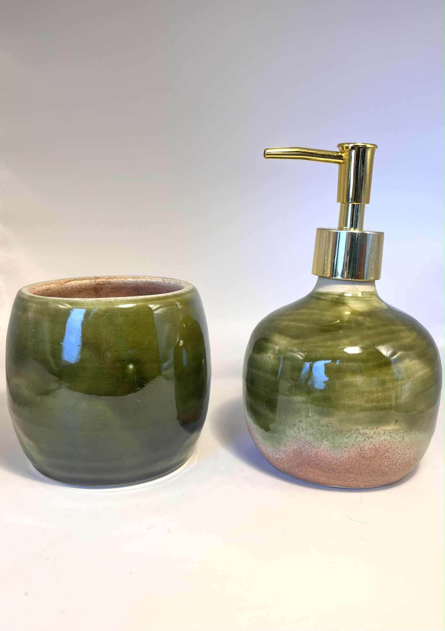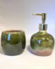 Zestaw pokryty jest szkliwem w pięknym, głębokim odcieniu zieleni i turkusu z subtelnymi przejściami kolorystycznymi, które nadają mu naturalny, organiczny charakter. Dzięki temu każdy egzemplarz jest jedyny w swoim rodzaju. Dozownik wyposażony jest w elegancką pompkę – do wyboru: złota, srebrna, czarna lub miedziana, co pozwala dopasować zestaw do stylu Twojej łazienki.