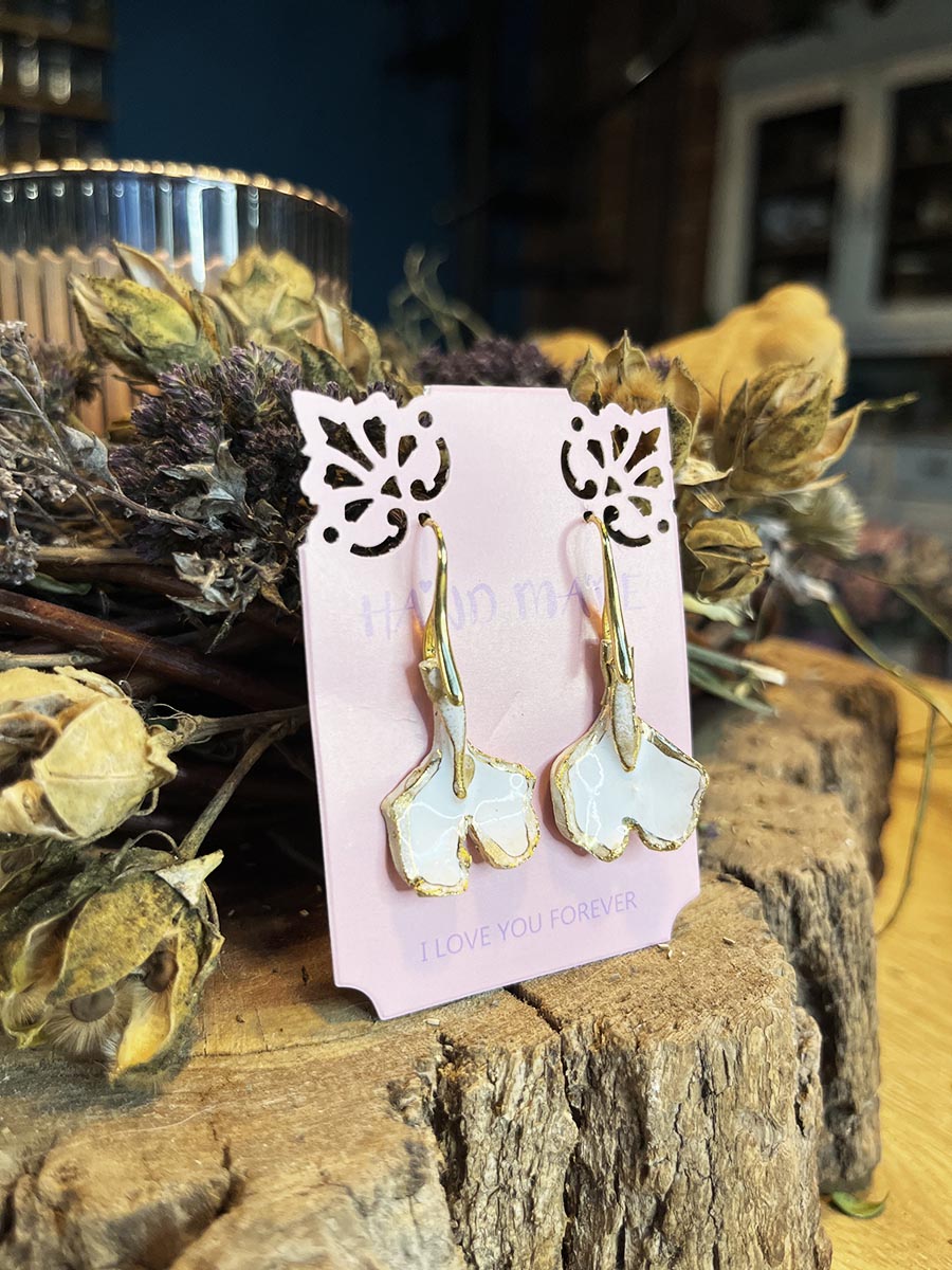 Te unikalne kolczyki zostały wykonane w naszej pracowni ceramicznej Nastawka, z najwyższą dbałością o detale. Inspirowane pięknem liści miłorzębu, kolczyki mają subtelny biały kolor z delikatnym złotym obramowaniem, co nadaje im elegancki i oryginalny charakter.