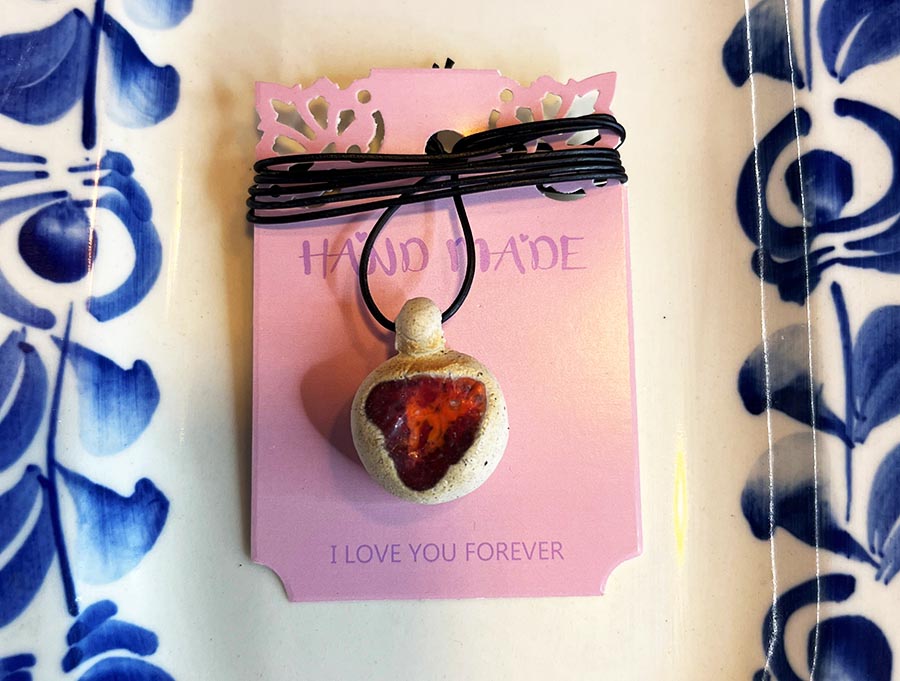 Naszyjniki „Ziemskie Skarby” to wyjątkowe, ręcznie robione wisiory, stworzone przy użyciu techniki fusingu, która łączy surową glinę z pięknie stopionym, kolorowym szkłem. Każdy wisior wygląda jak naturalna skamielina, w której ukryty jest szlachetny kamień, nadając biżuterii unikalny, organiczny charakter. Zewnętrzna, chropowata powierzchnia surowej gliny kontrastuje z wewnętrznym, błyszczącym szkiełkiem, które dostępne jest w kilku kolorach:
