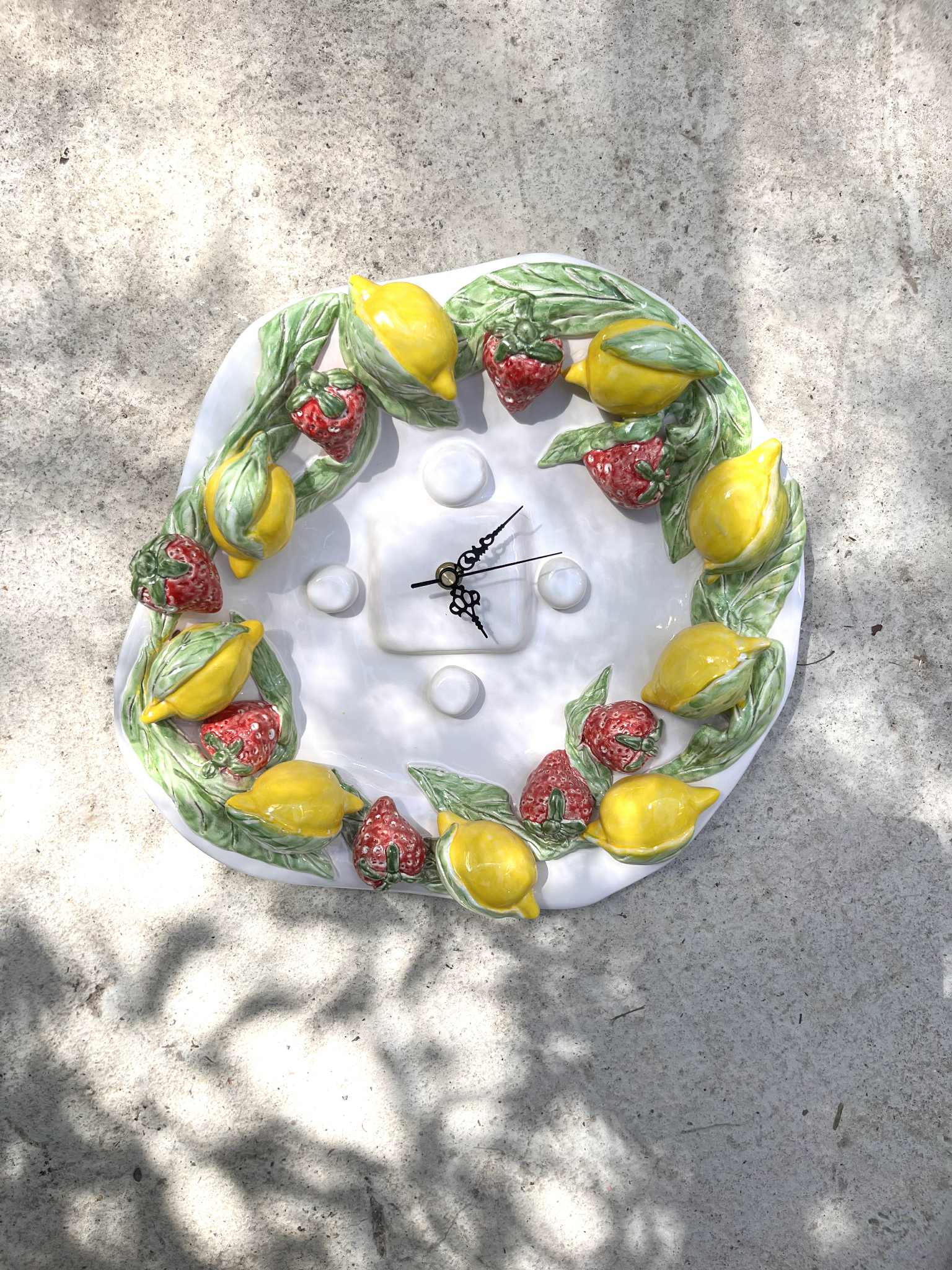 Ten duży, ręcznie wykonany ceramiczny zegar ścienny to jedyny w swoim rodzaju egzemplarz inspirowany tradycyjnym sycylijskim i śródziemnomorskim designem. Ozdobiony ręcznie rzeźbionymi cytrynami i bujnymi zielonymi liśćmi, stanowi żywy i wesoły akcent w każdej kuchni lub jadalni.