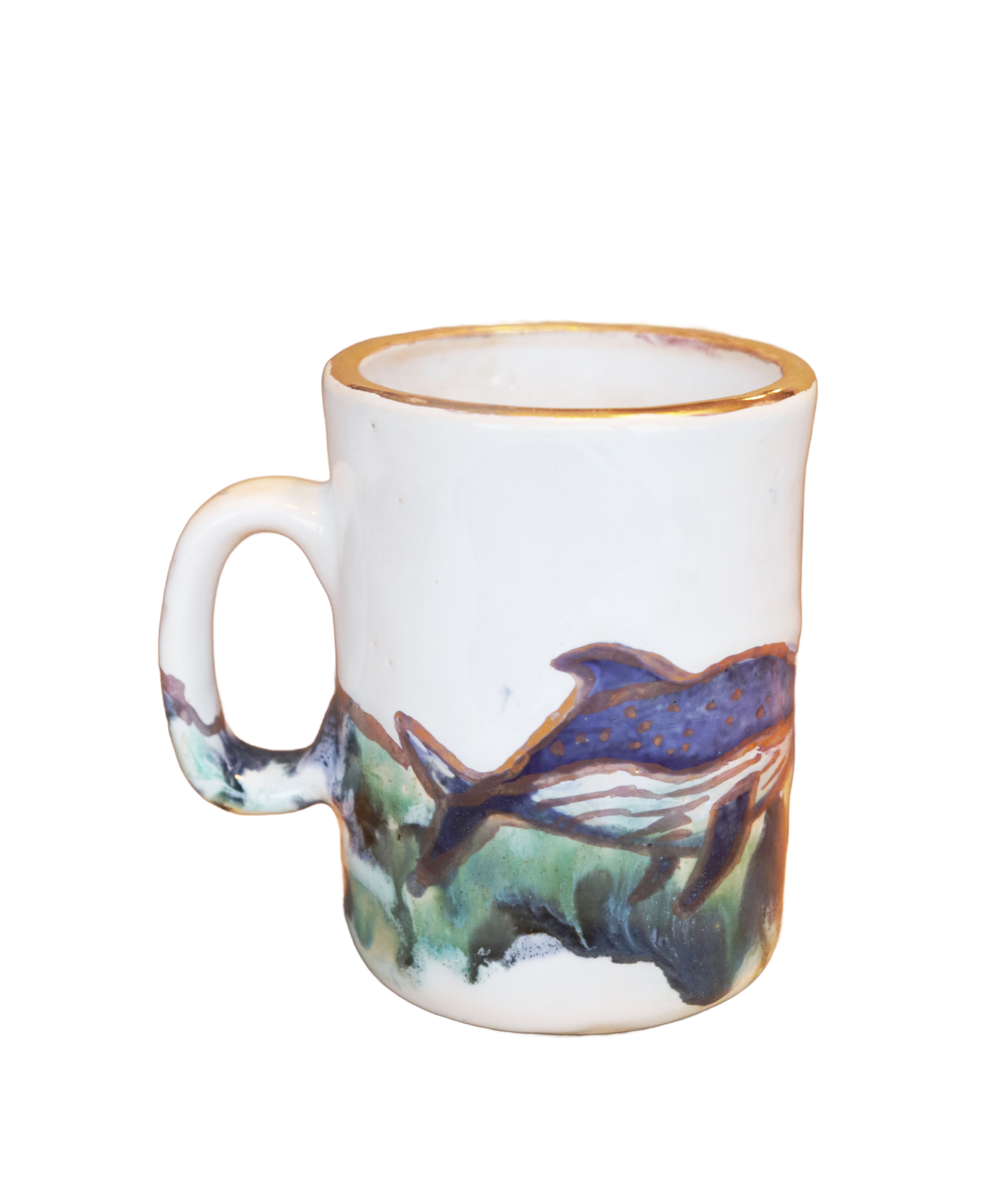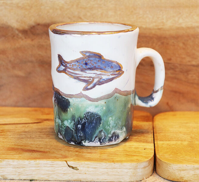 Ręcznie wykonany ceramiczny kubek, ozdobiony unikatowym malowidłem przedstawiającym delfina i wieloryba. Obrzeża oraz detale motywów zostały pokryte prawdziwym złotem, co nadaje kubkowi elegancji i wyjątkowego blasku. Motywy zwierząt morskich harmonijnie łączą się z subtelnymi odcieniami zieleni i granatu, przywodzącymi na myśl spokojne wody oceanu.