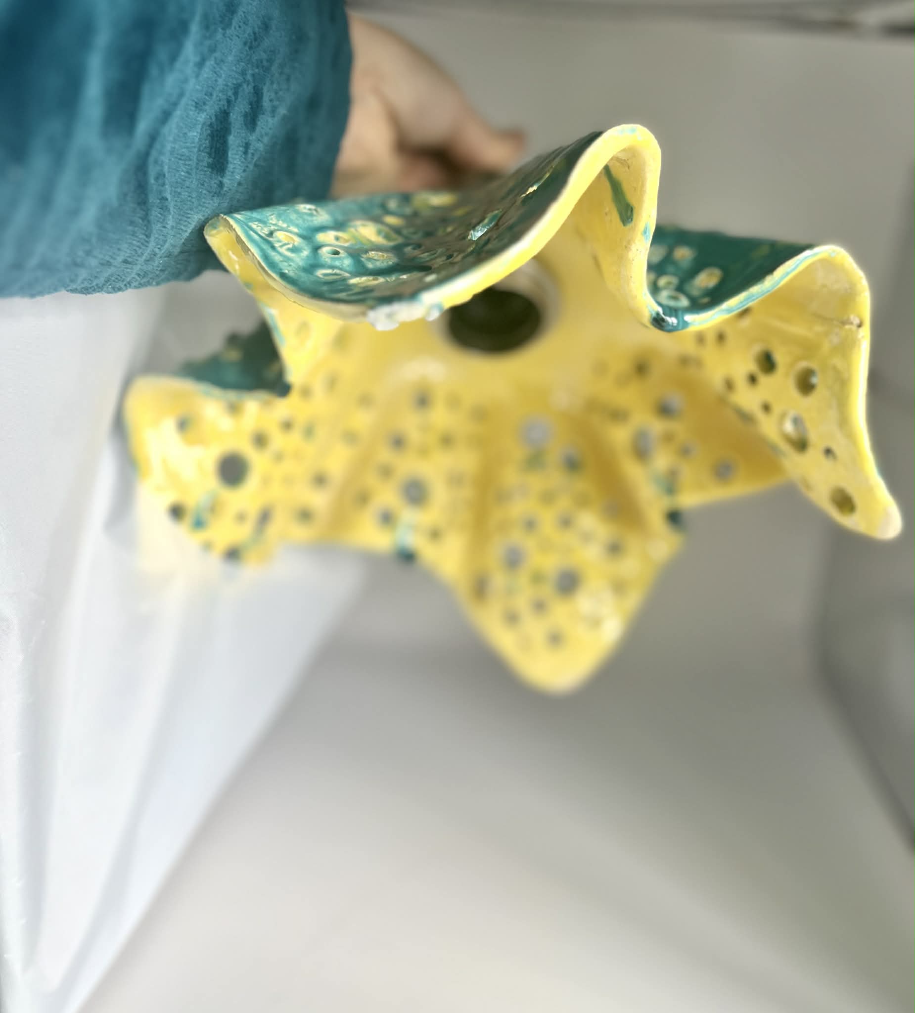 • Kolorystyka: turkusowa glazura z zewnątrz, intensywnie żółte wnętrze