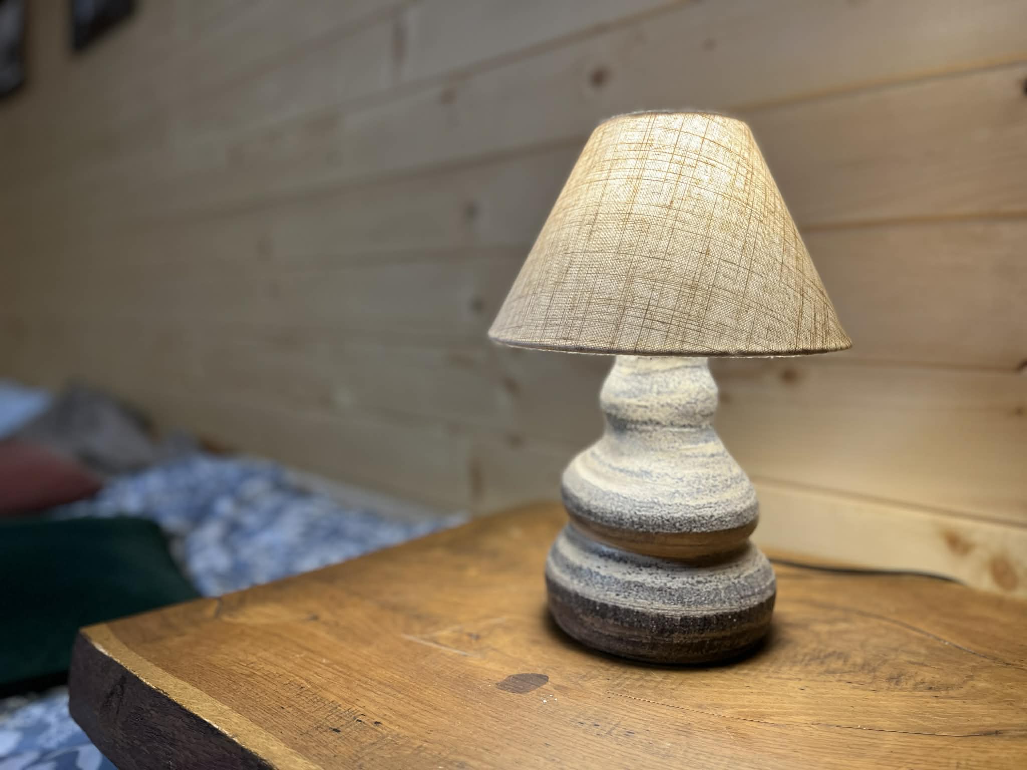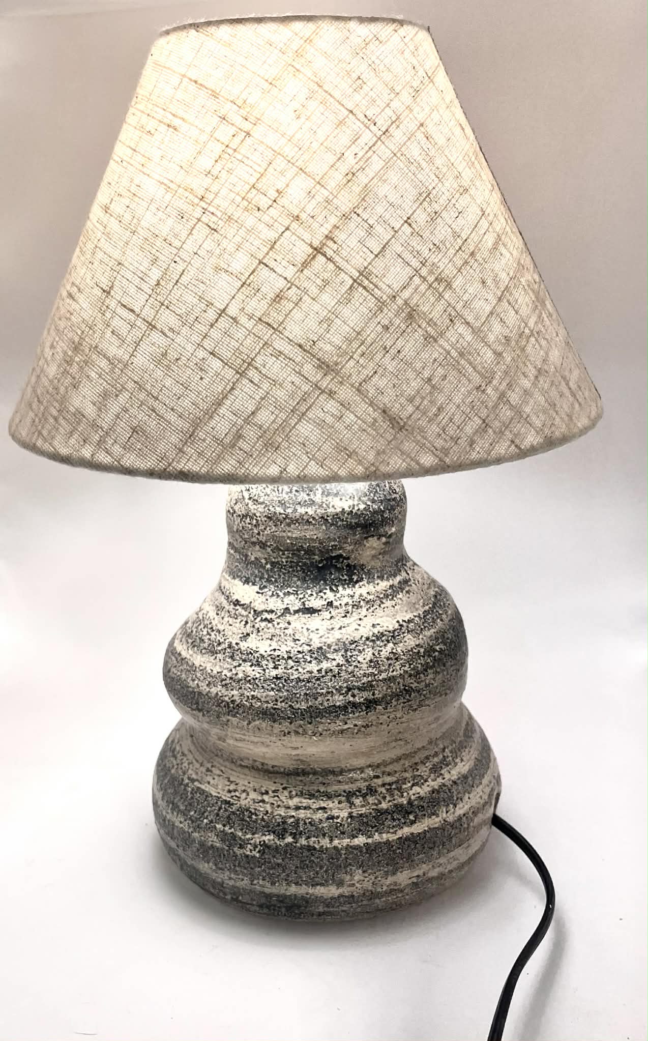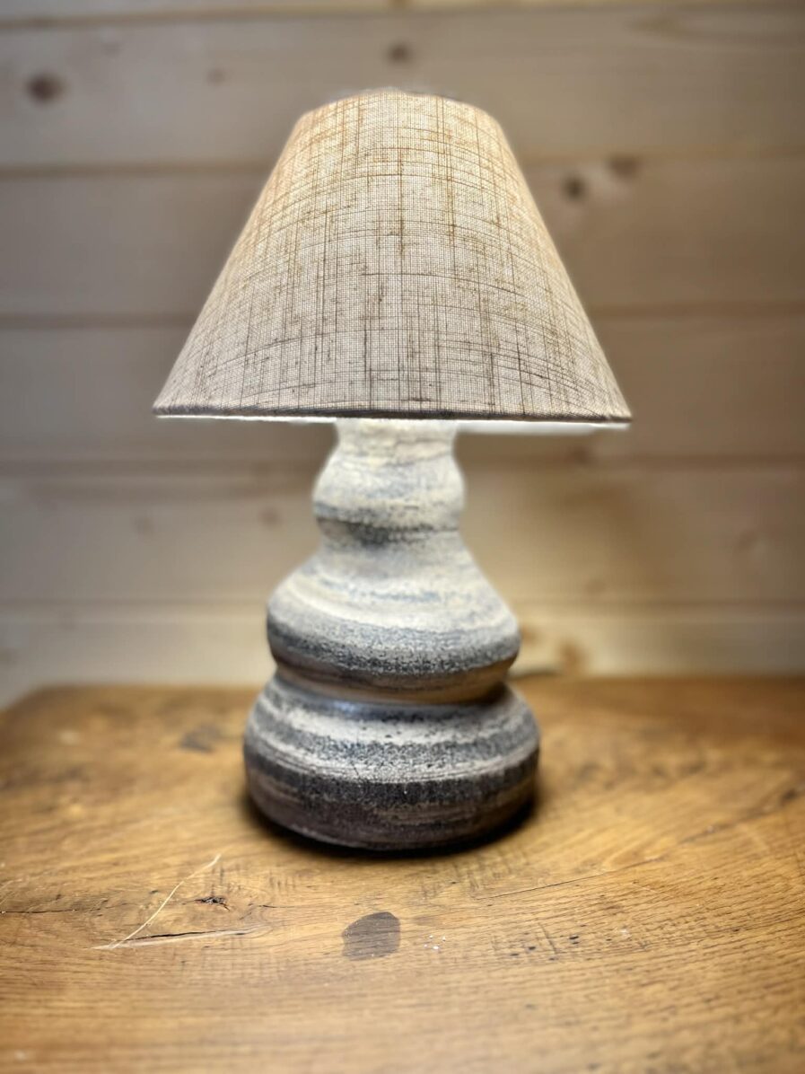 Lampa stołowa „Marmurkowa” to pojedynczy, niepowtarzalny egzemplarz wykonany w mojej pracowni ceramicznej. Jej rzeźbiarska podstawa została ręcznie wytoczona na kole garncarskim, warstwa po warstwie, z dbałością o każdy detal. Charakterystyczny, marmurkowy rysunek powstał w wyniku autorskiej techniki łączenia mas ceramicznych — nie ma dwóch takich samych form, a ten konkretny model jest absolutnie jedyny w swoim rodzaju.
