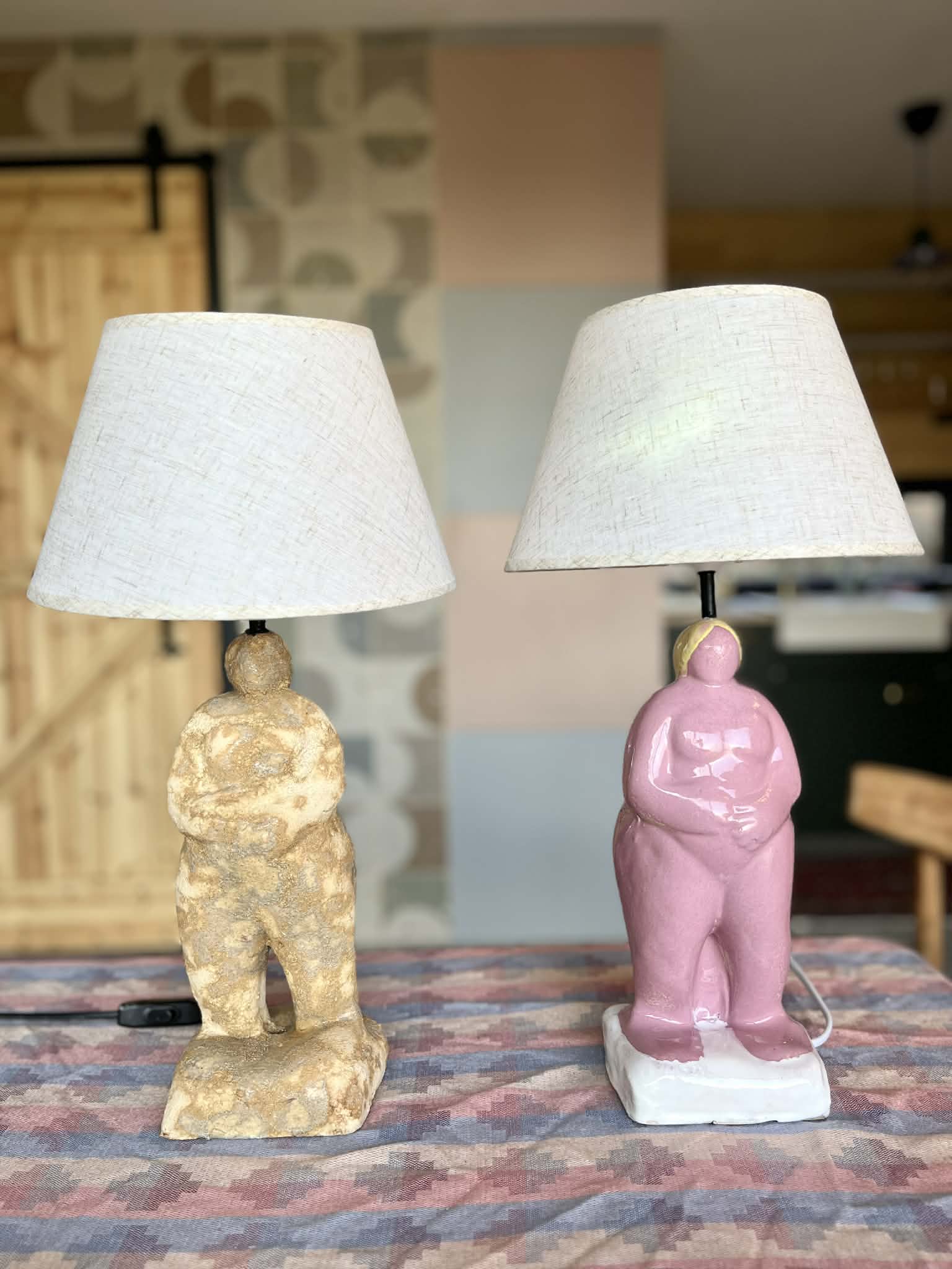 SHE • Stonebody, Matowa, surowa, jak skamielina. Symbol siły, stabilności i zakorzenienia w swojej prawdzie. Każda lampa ma 50 cm wysokości (z abażurem), a abażur o średnicy 25 cm daje miękkie, rozproszone światło. Obie wersje będą dostępne w stałej ofercie sklepu. To nie tylko lampy — to manifest. Światło, które przypomina, że kobiece ciało nie potrzebuje zgody, by istnieć.