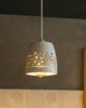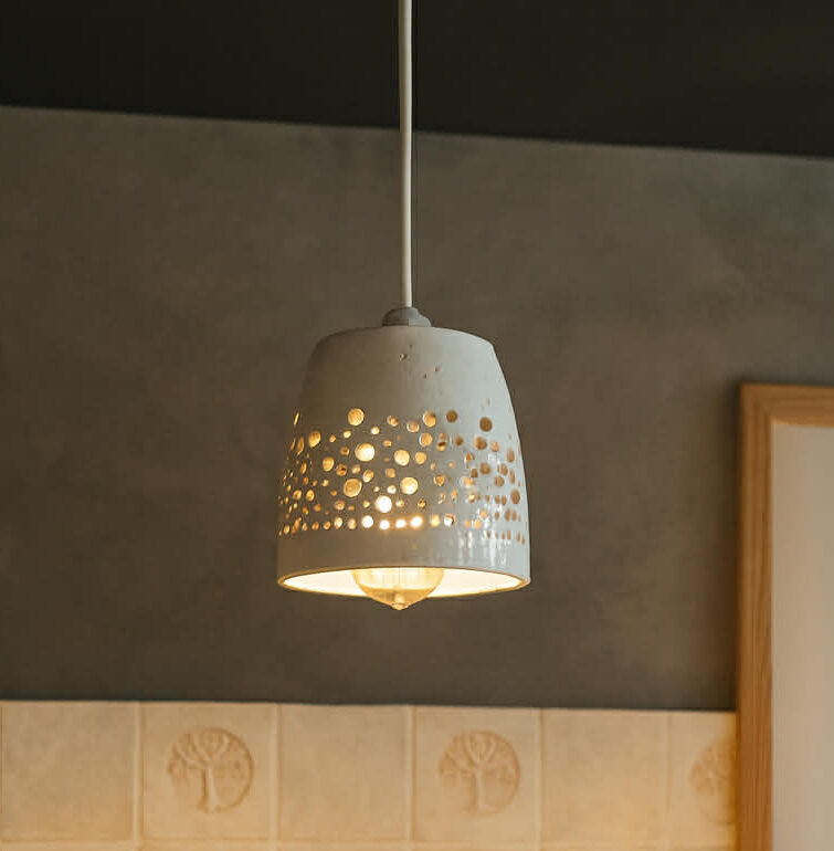 Charakterystyczne okrągłe otwory pozwalają światłu pięknie rozpraszać się po pomieszczeniu, tworząc nastrojowy, artystyczny efekt. Transparentne szkliwo podkreśla naturalne piękno gliny, z jej delikatnymi czarnymi cętkami, nadając lampie niepowtarzalny wygląd.