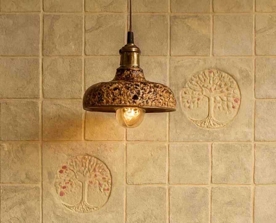 Charakterystyczne okrągłe otwory pozwalają światłu pięknie rozpraszać się po pomieszczeniu, tworząc nastrojowy, artystyczny efekt. Transparentne szkliwo podkreśla naturalne piękno gliny, z jej delikatnymi czarnymi cętkami, nadając lampie niepowtarzalny wygląd.