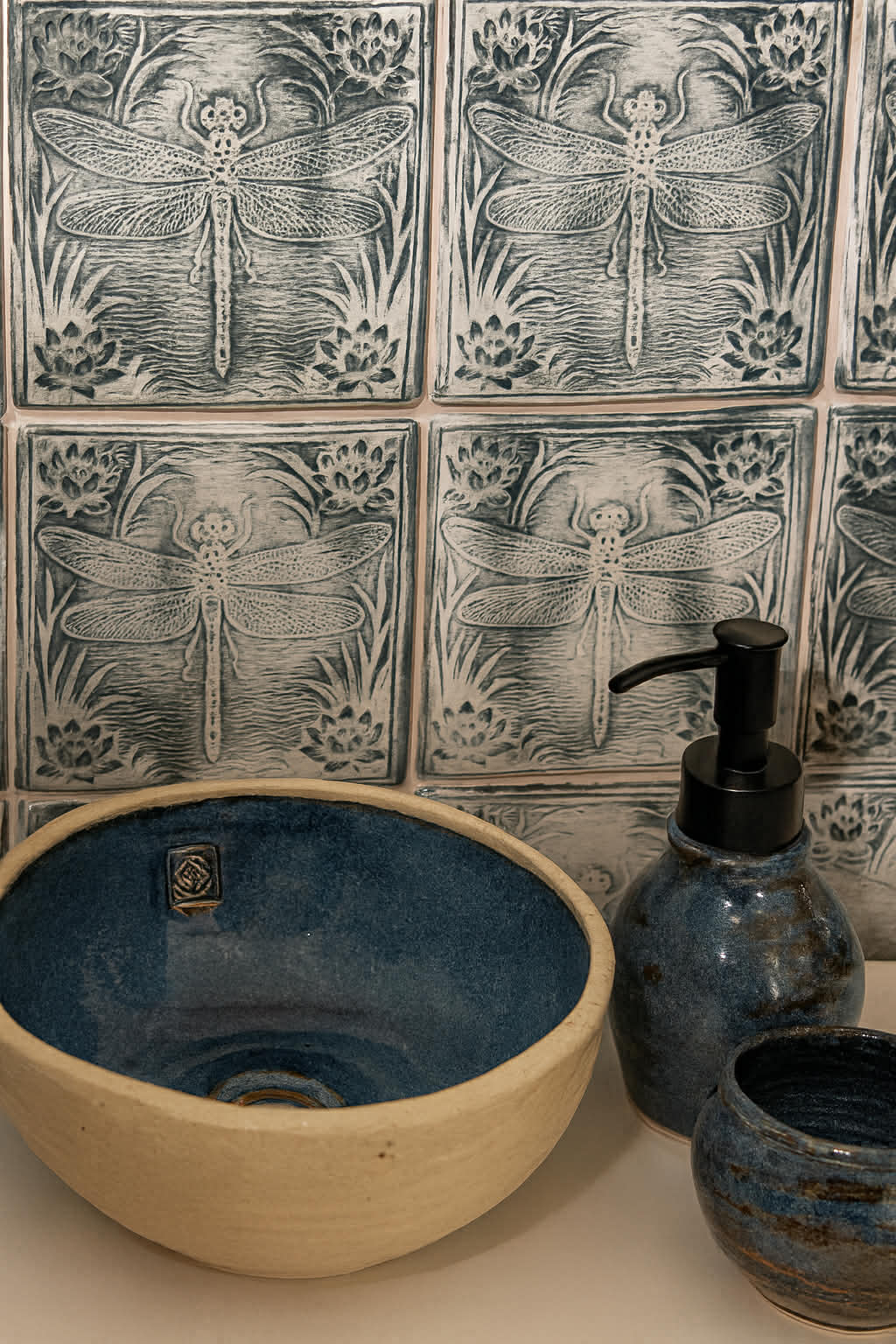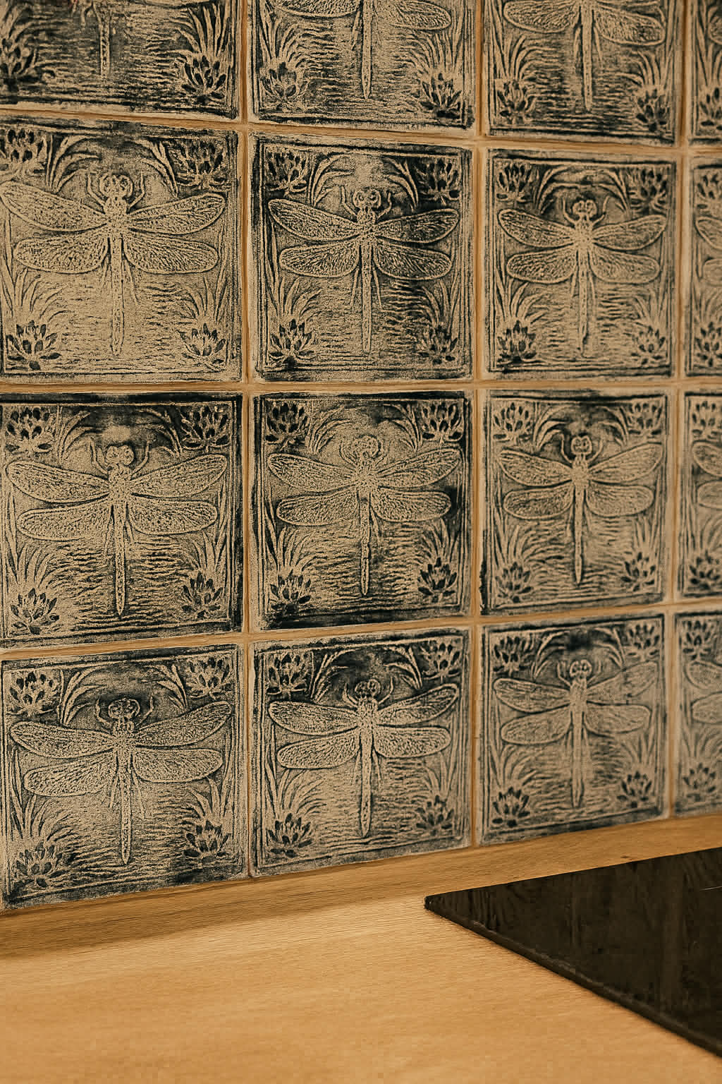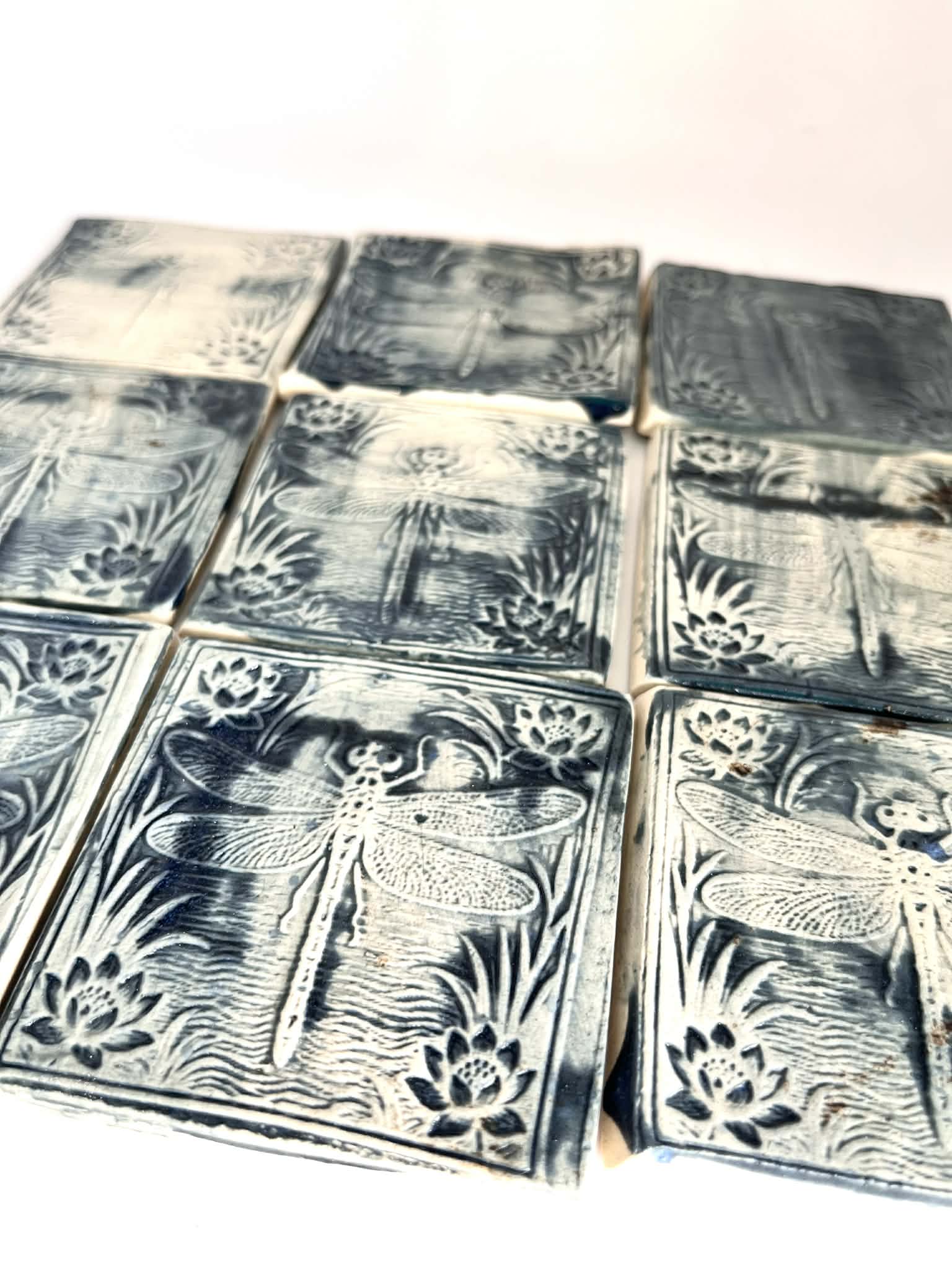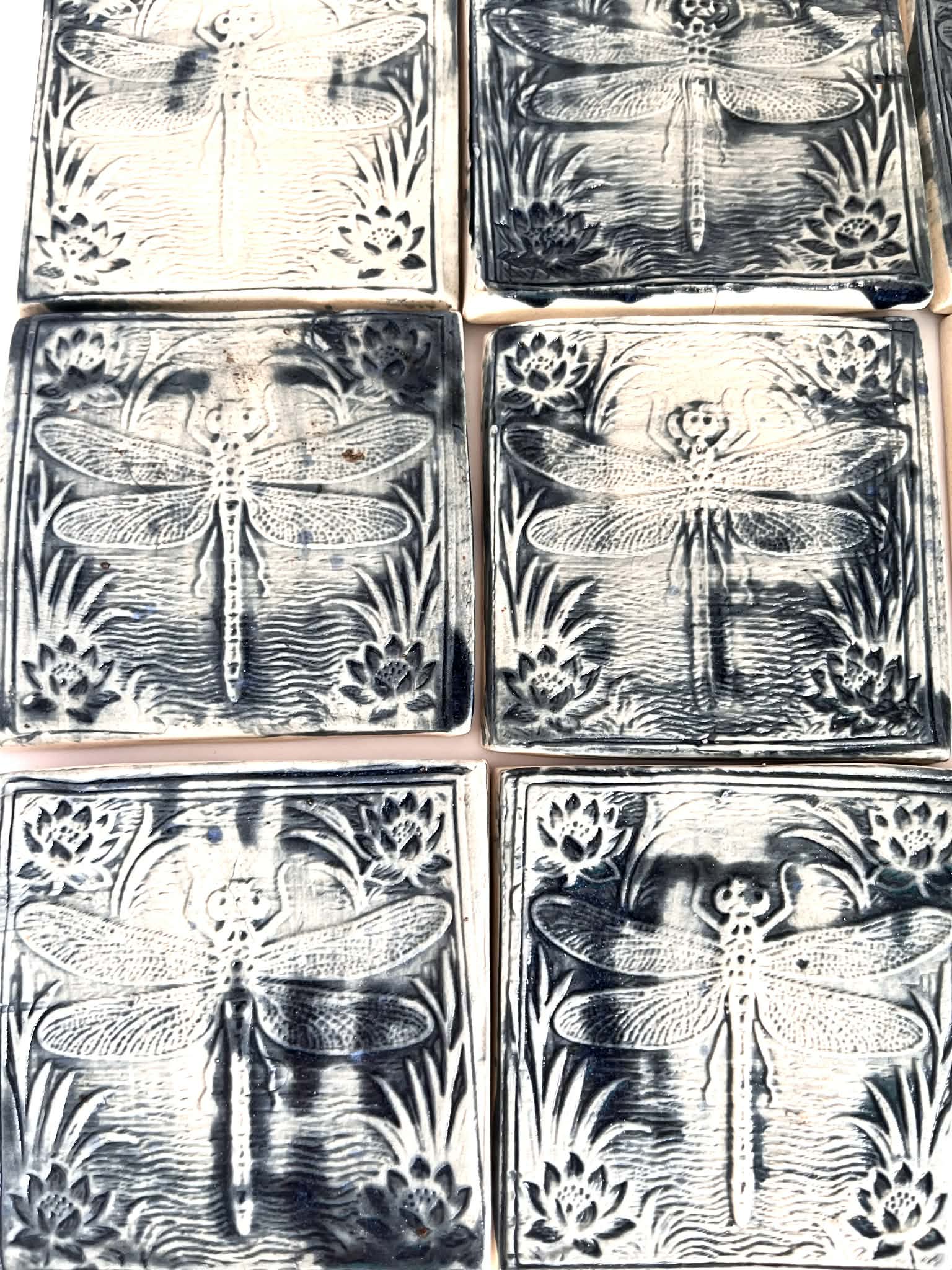 Każda płytka jest ręcznie formowana, z motywem ważki.