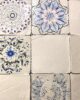 Kolekcja „Rozeta Mix” to luksusowe, ręcznie robione płytki ceramiczne o wymiarach 18 x 18 cm, w których co kilka kafli pojawia się ręcznie malowany, piękny wzór rozet inspirowany tradycyjnym haftem.