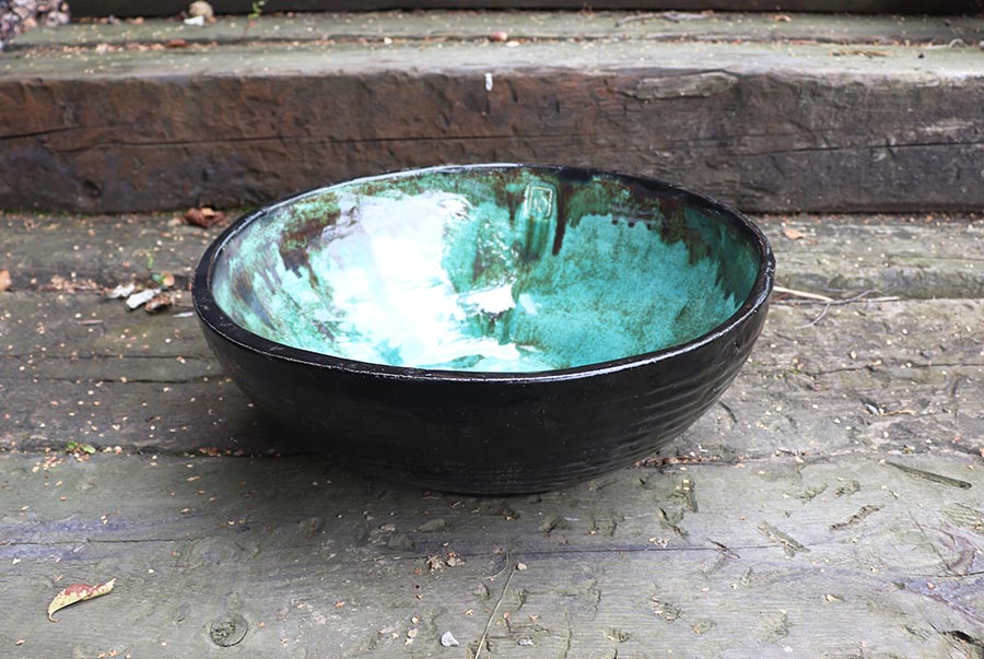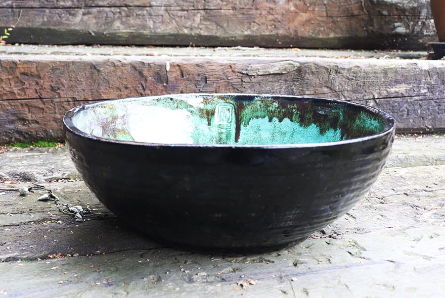 Kolor i faktura: Wnętrze emanuje turkusowym szkliwem, wzbogaconym o drobne, ciemne plamki. Ta gra barw subtelnie nawiązuje do naturalnych wzorów roślinnych – szczególnie do liści funkii.