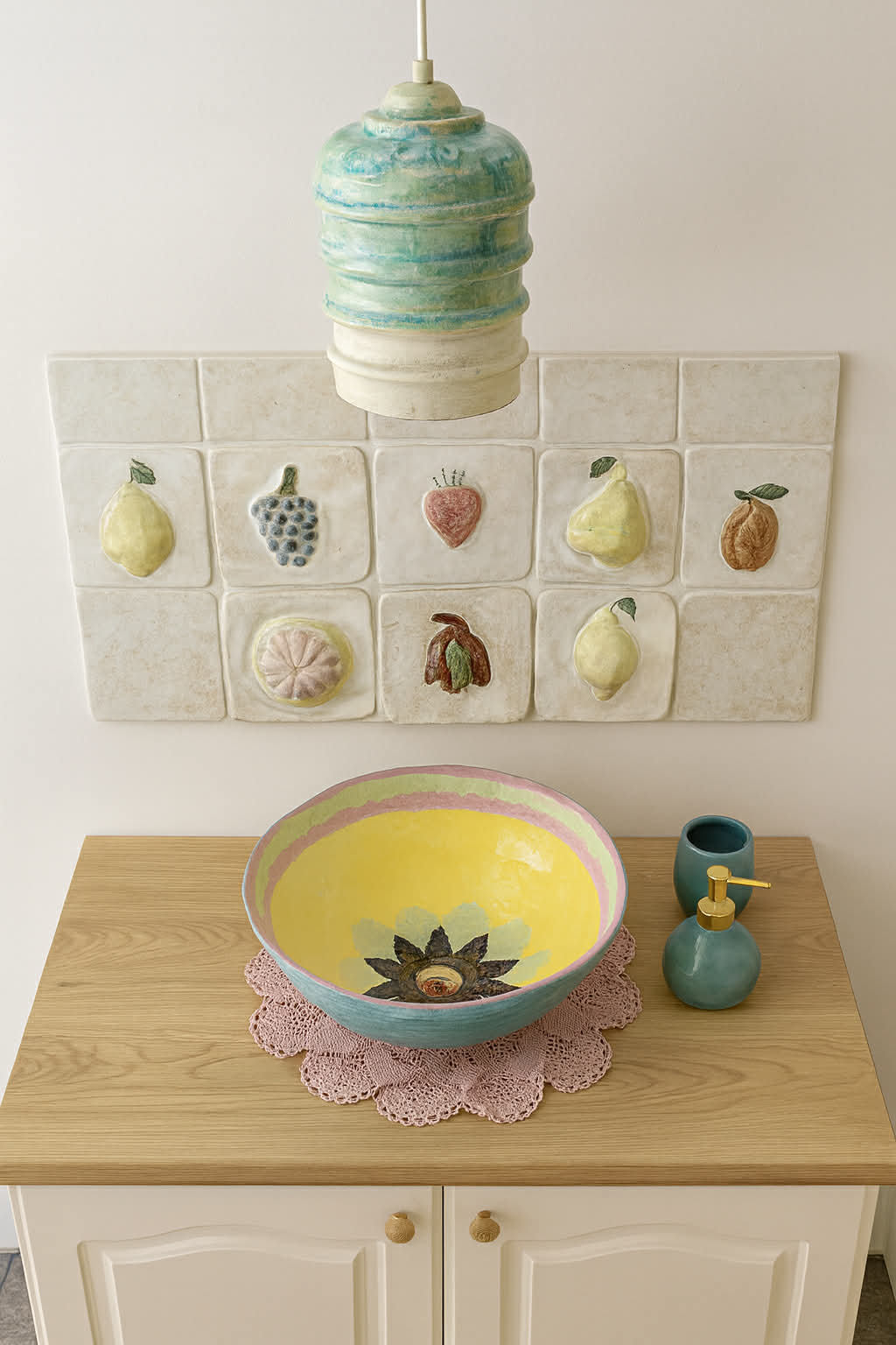 Przepiękna ozdoba łazienki. Umywalka ręcznie malowana z odbitymi haftowanymi serwetami .